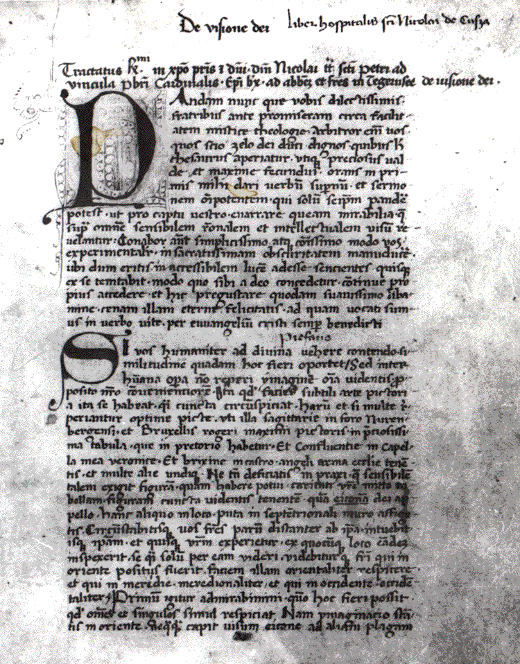 Nicholas of Cusa (1401-1464), sometimes misleadingly referred to as the first "modern" philosopher, was born in Kues, Germany (today Bernkastel-Kues). He became a canon lawyer and a cardinal. His two best-known works are De Docta Ignorantia (On Learned Ignorance) and De Visione Dei (On the Vision of God).